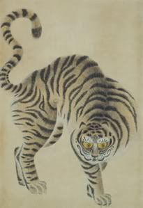 El tigre o horangi… Se creía en gran parte que era un guardián compasivo que protegía a los seres humanos y que aún les mostraba gratitud por su bondad, se representaba como una criatura gentil y dócil más que una bestia feroz. Aún más, la creencia subyacente era que se trataba de un animal temerario y valiente que podía prevenir desgracias tales como incendios, inundaciones y tormentas y alejar malos conjuros. Estos cuadros eran colocados en la puerta principal y otros lugares en la casa el Día de Año Nuevo con la esperanza de que marcara el comienzo de un año maravilloso.